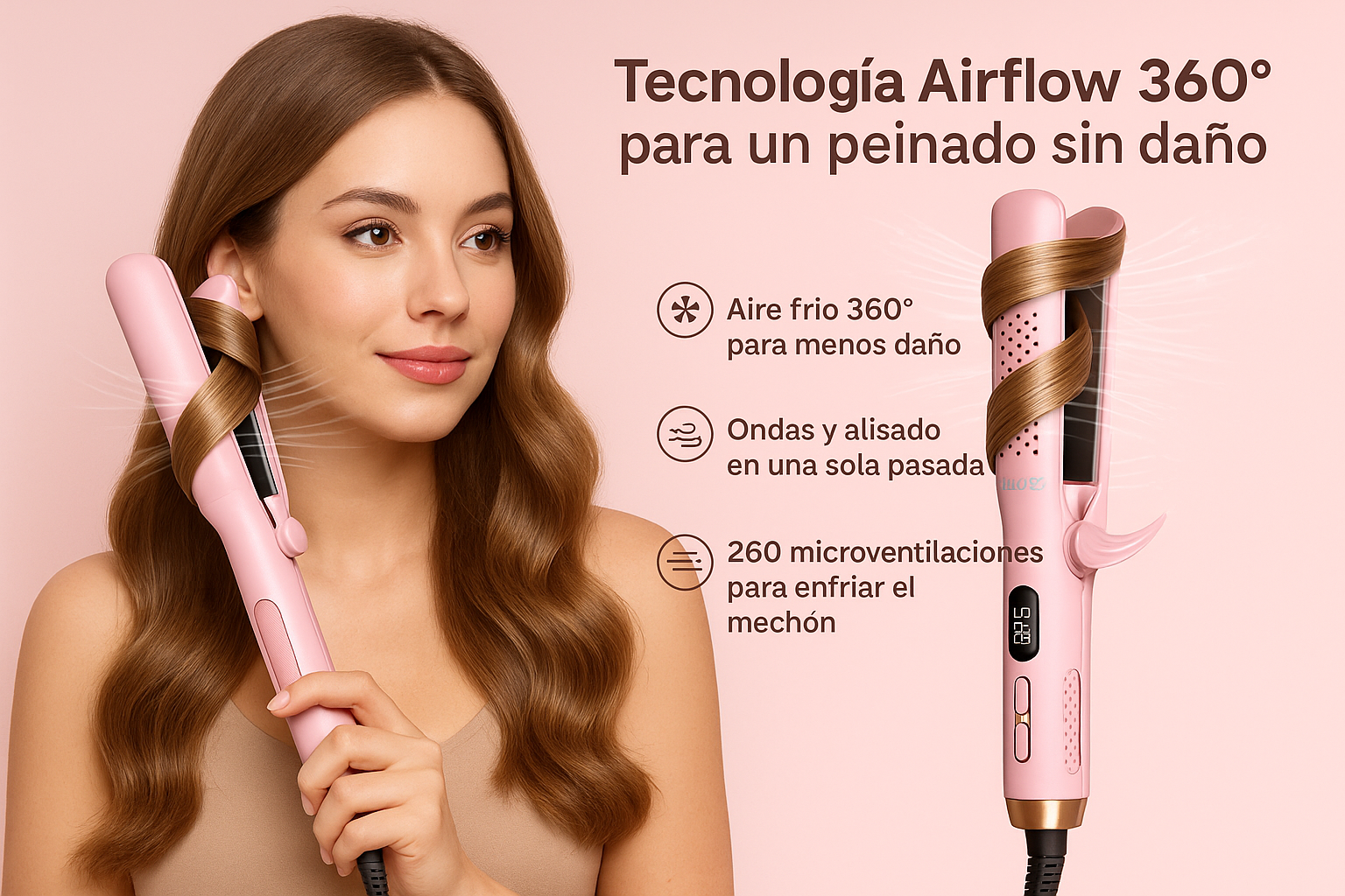• Sistema Airflow 360° que reduce la exposición directa a calor extremo y protege la fibra capilar.